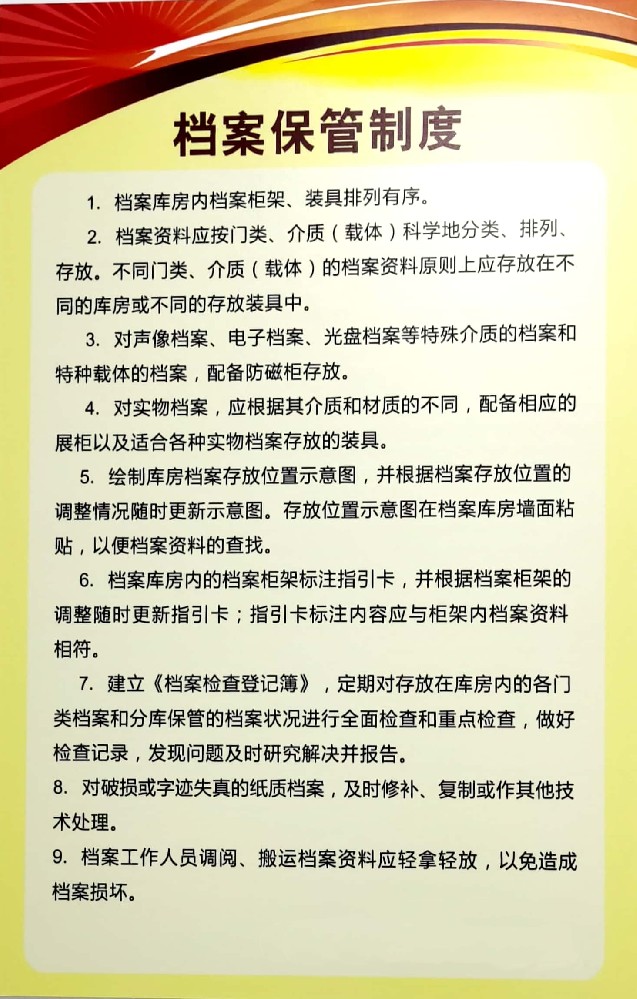 檔案保管制度1. 檔案庫房內檔案柜架、裝具排列有序。2. 檔案資料應按門類、介質(載體)科學地分類、排列、存放。不同門...