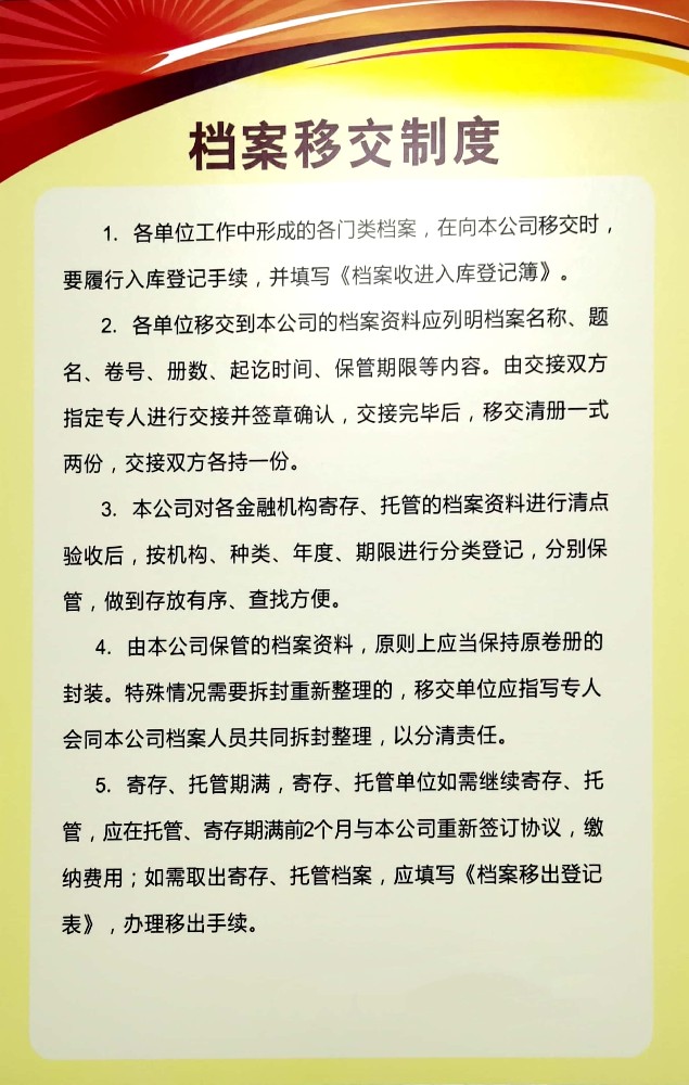 檔案移交制度1. 各單位工作中形成的各門類檔案,在向本公司移交時,要履行入庫登記手續,并填寫《檔案收進入庫登記簿》。2. 各單位移交到本公司的檔案資料應列明檔案名稱、題名、卷號、冊數、起訖時間、保管期限等內容。由交接雙方指定專人進行交接并簽章確認,交接完畢后,移交清冊一式兩份,交接雙方各持一份。3. 本公司對...