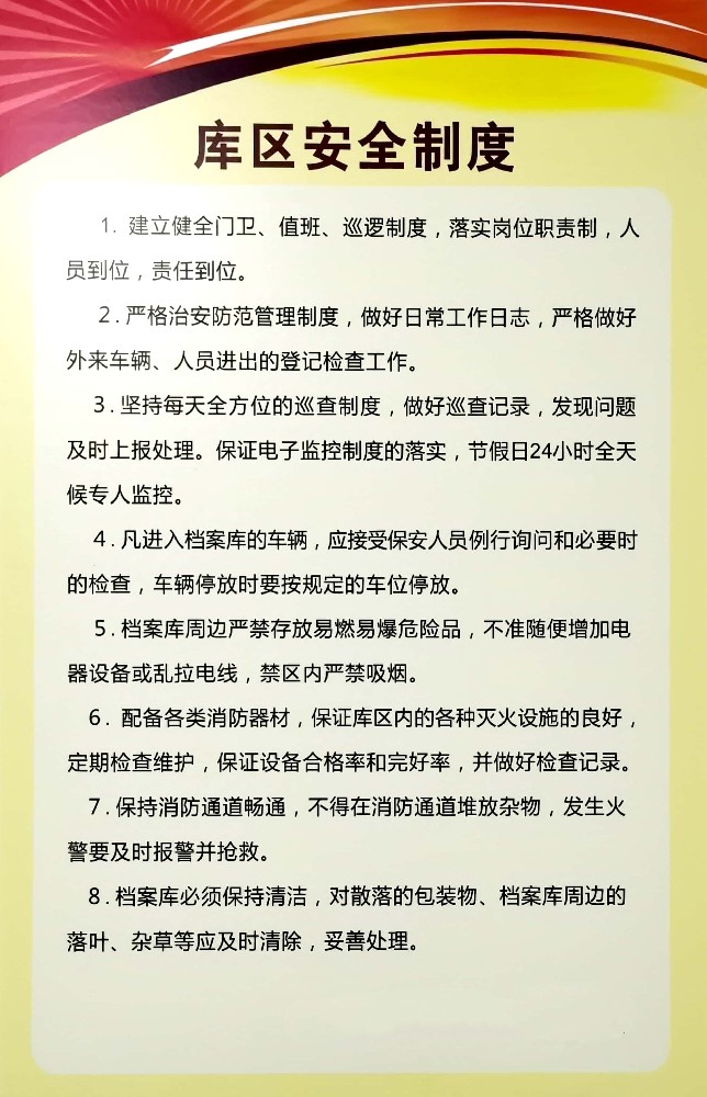 庫區安全制度1.建立健全門衛、值班、巡邏制度,落實崗位職責制,人員到位,責任到位。2.嚴格治安防范管理制度,做好日常工作日志,嚴格做好外來車輛、人員進出的登記檢查工作。3.堅持每天全方位的巡查制度,做好巡查記錄,發現問題及時上報處理。保證電子監控制度的落實,節假日24小時全天候專人監控。4.凡進入檔案庫的車輛...