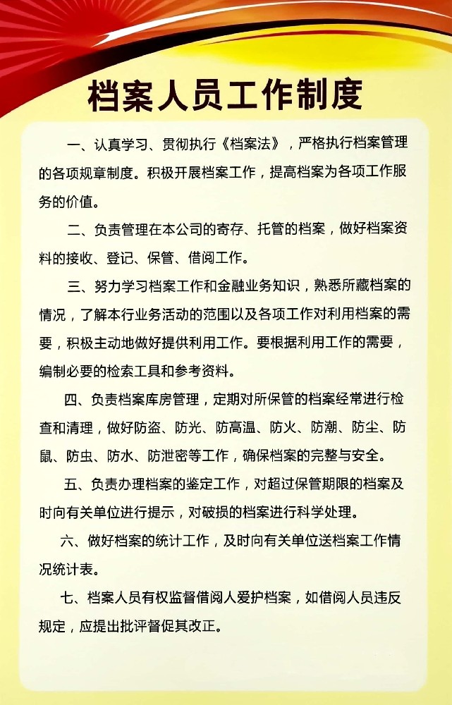 檔案人員工作制度一、認真學習、貫徹執行《檔案法》,嚴格執行檔案管理的各項規章制度。積極開展檔案工作,提高檔案為各項工作服務的價值。二、負責管理在本公司的寄存、托管的檔案,做好檔案資料的接收、登記、保管、借閱工作。三、努力學習檔案工作和金融業務知識,熟悉所藏檔案的情況,了解本行業務活動的范圍以及各項工...