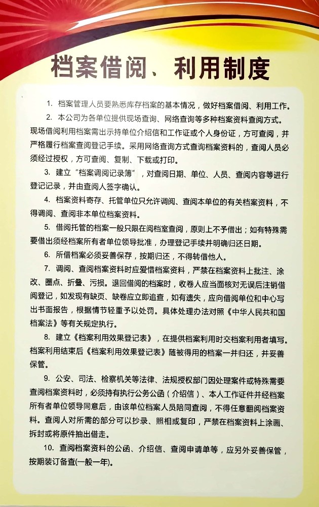 檔案借閱、利用制度1.檔案管理人員要熟悉庫存檔案的基本情況,做好檔案借閱、利用工作。2.本公司為各單位提供現場查詢、網絡查詢等多種檔案資料查閱方式?,F場借閱利用檔案需出示持單位介紹信和工作證或個人身份證,方可查閱,并嚴格履行檔案查閱登記手續。采用網絡查詢方式查詢檔案資料的,查閱人員必須經過授...