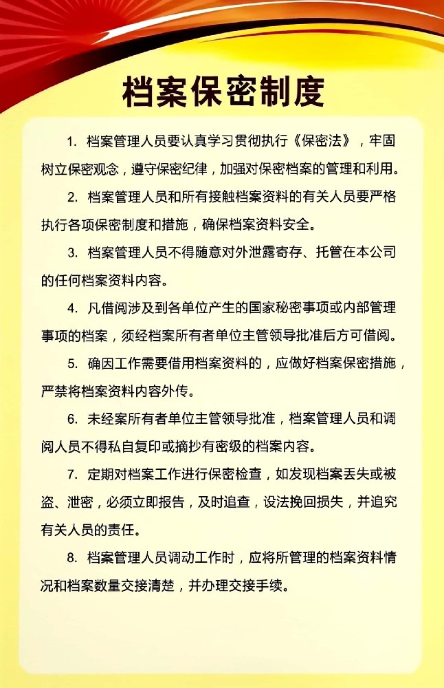 檔案保密制度1. 檔案管理人員要認真學習貫徹執行《保密法》,牢固樹立保密觀念,遵守保密紀律,加強對保密檔案的管理和利用。2. 檔案管理人員和所有接觸檔案資料的有關人員要嚴格執行各項保密制度和措施,確保檔案資料安全。3. 檔案管理人員不得隨意對外泄露寄存、托管在本公司的任何檔案資料內容。4.凡借閱涉及到各單位產生...